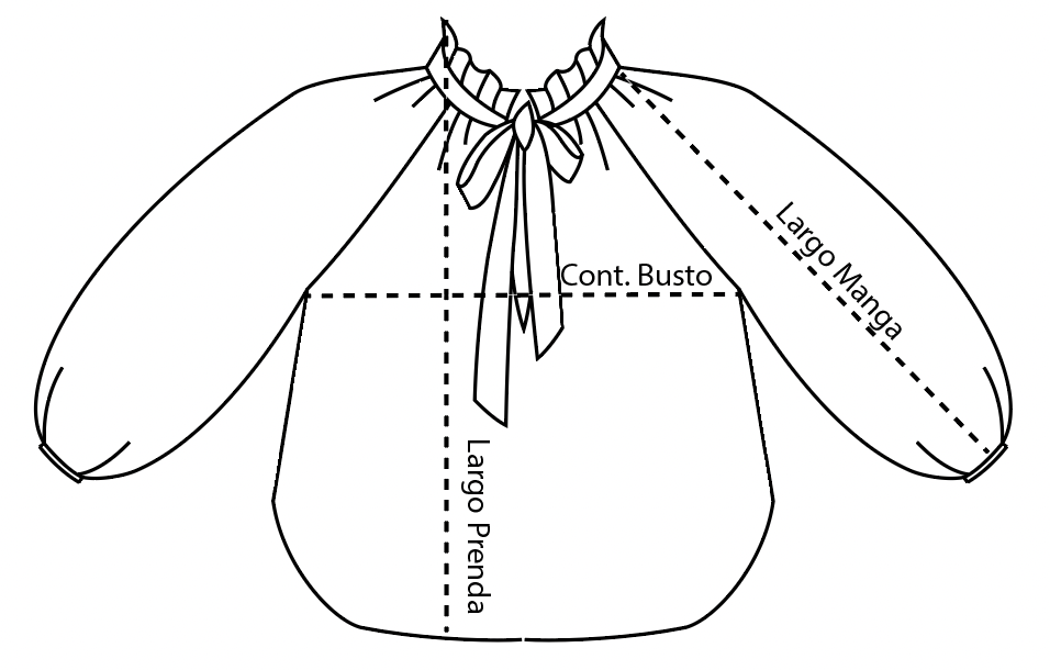 - Blusa con manga larga abullonada, tiras en los costados del cuello para anudarlo o para dejarlo suelto y que de mas escote.