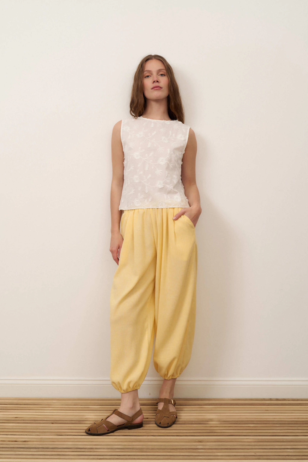 - Blusa cuello redondo, sin mangas, con detalle de botón en la espalda.