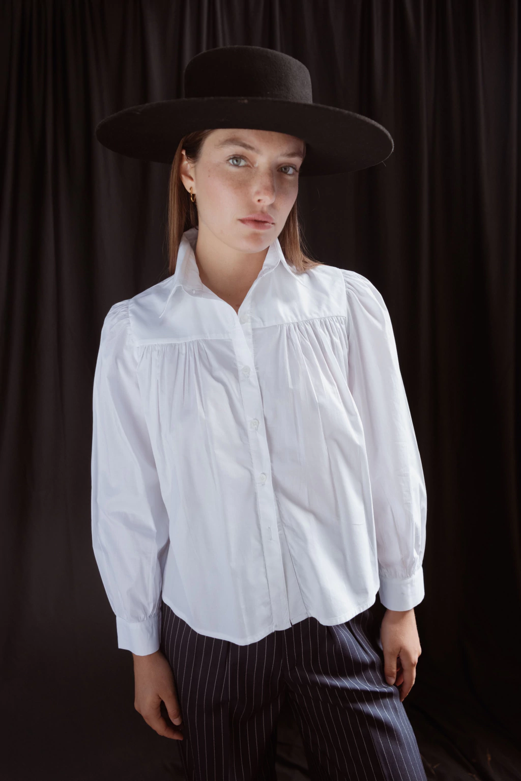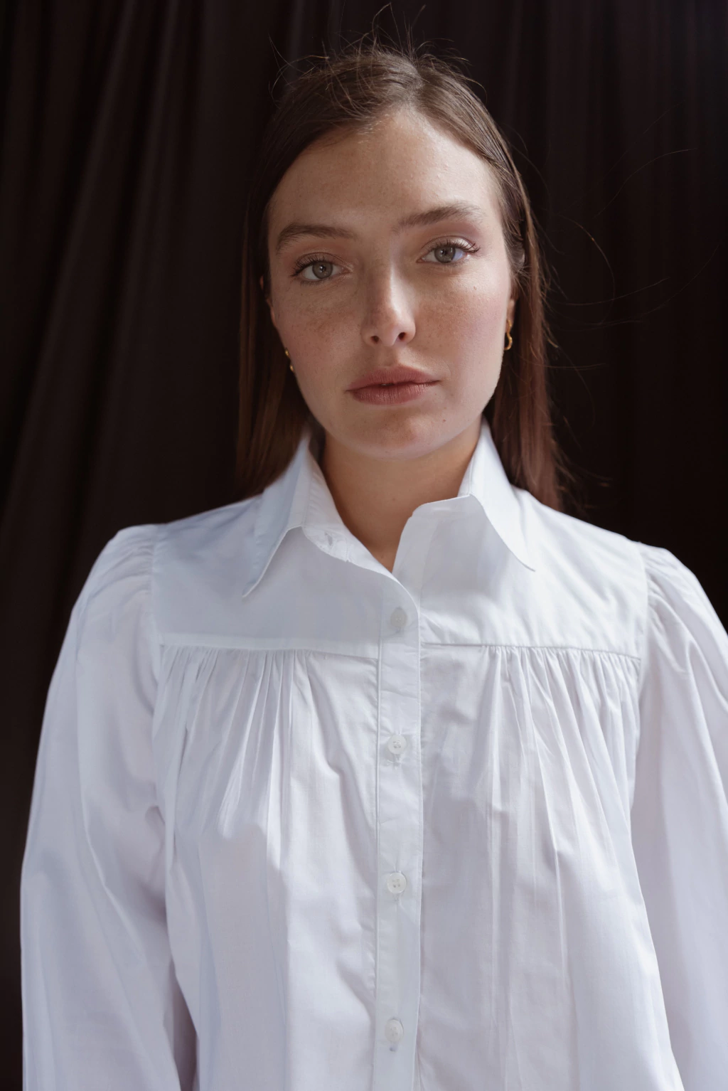 - Camisa manga larga con frunces en el pecho y en las mangas.