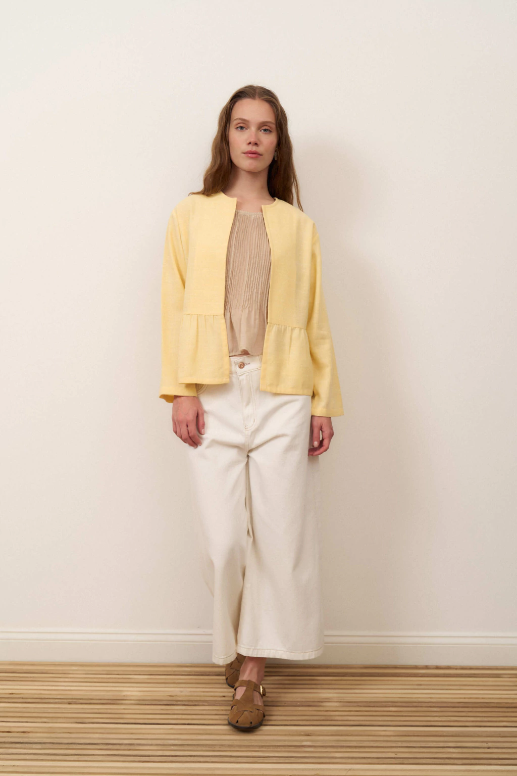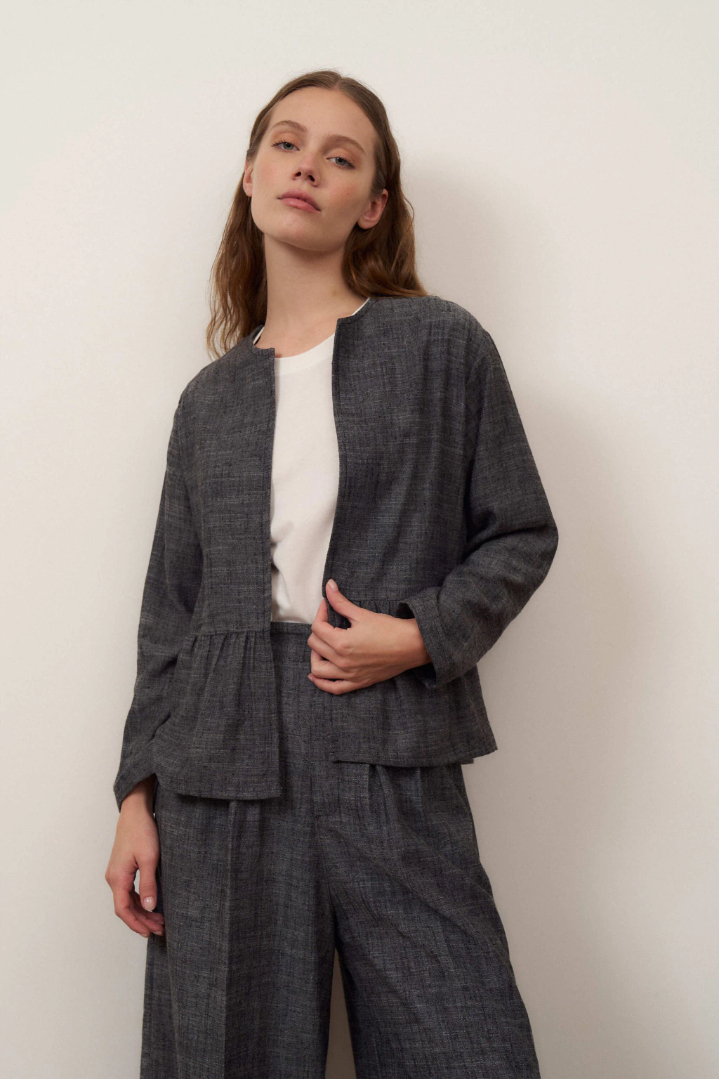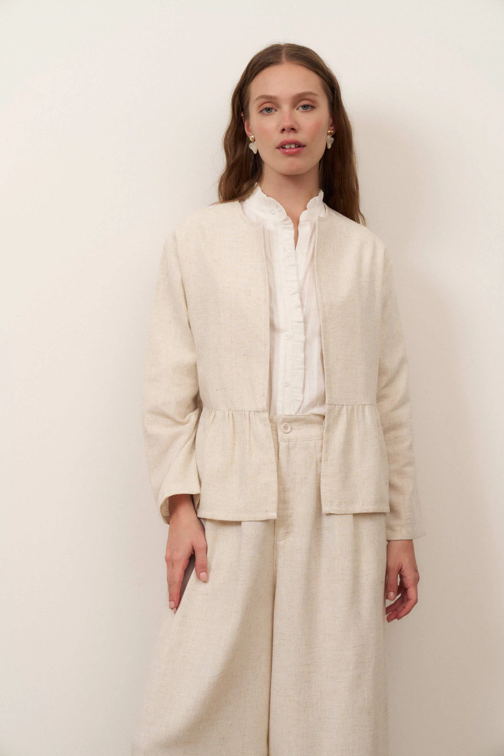 - Chaqueta con cuello a la base y recorte en la cintura.