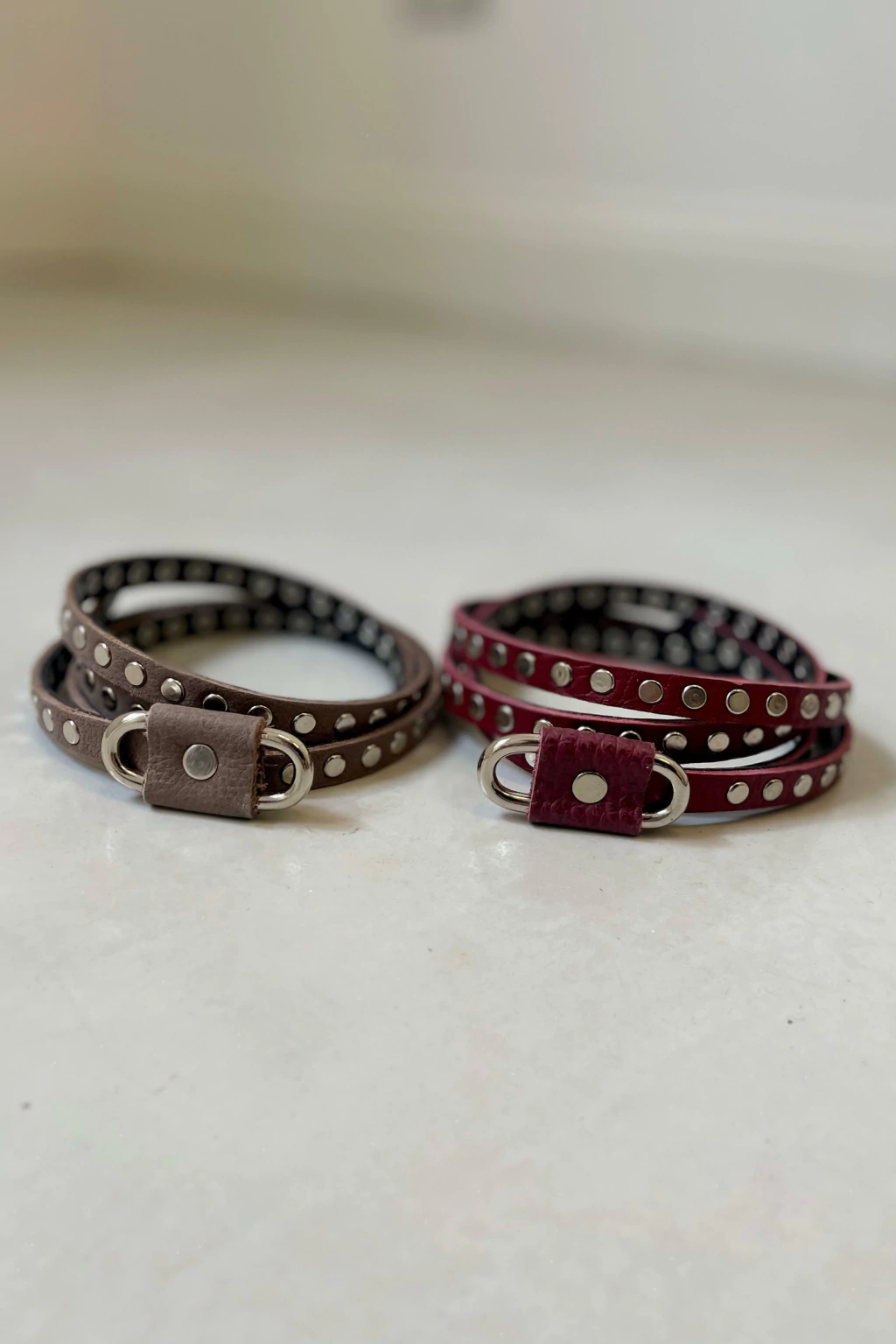 - Cinturon de cuero negro con tachas y hebilla metálica plateada.