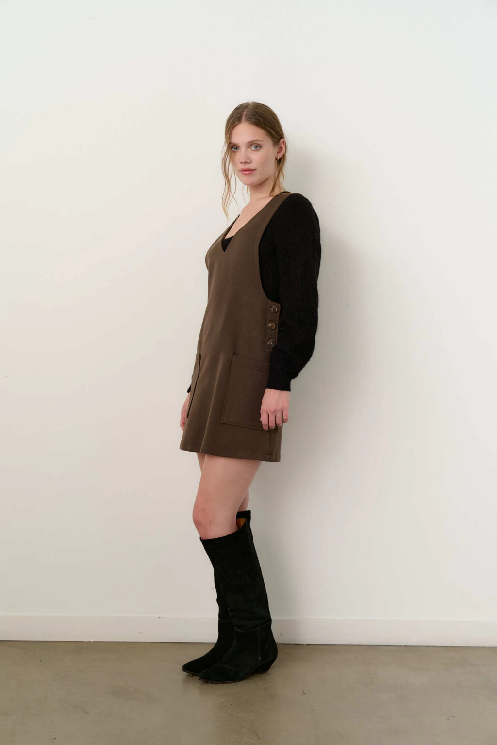 - Jumper corto con botones en los laterales, ideal para combinar con una polera debajo, medias largas y botas altas, creando un look cálido y moderno para esta temporada.