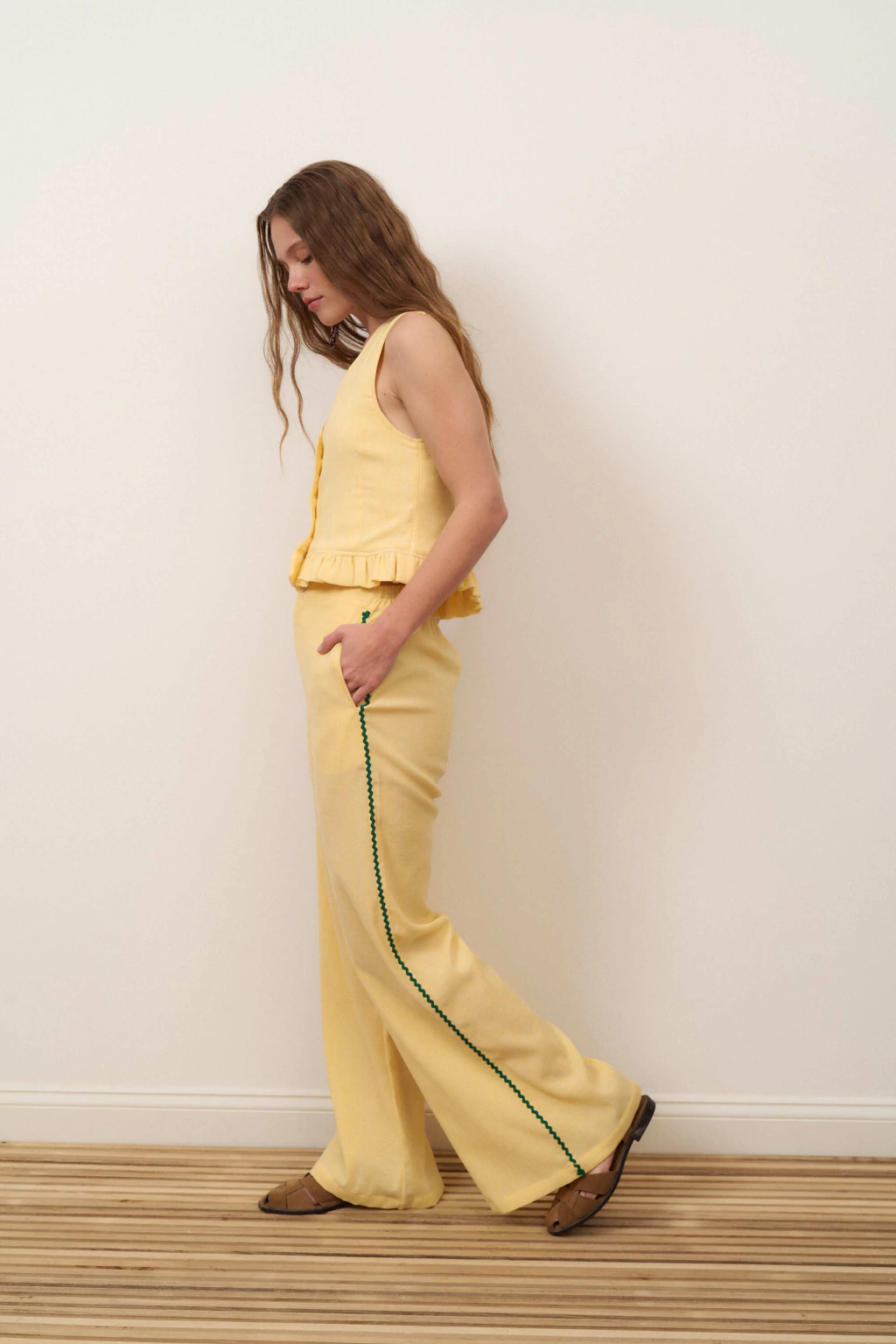 - Pantalón oxford tiro medio con elástico en la parte trasera , cinta de color en los laterales.