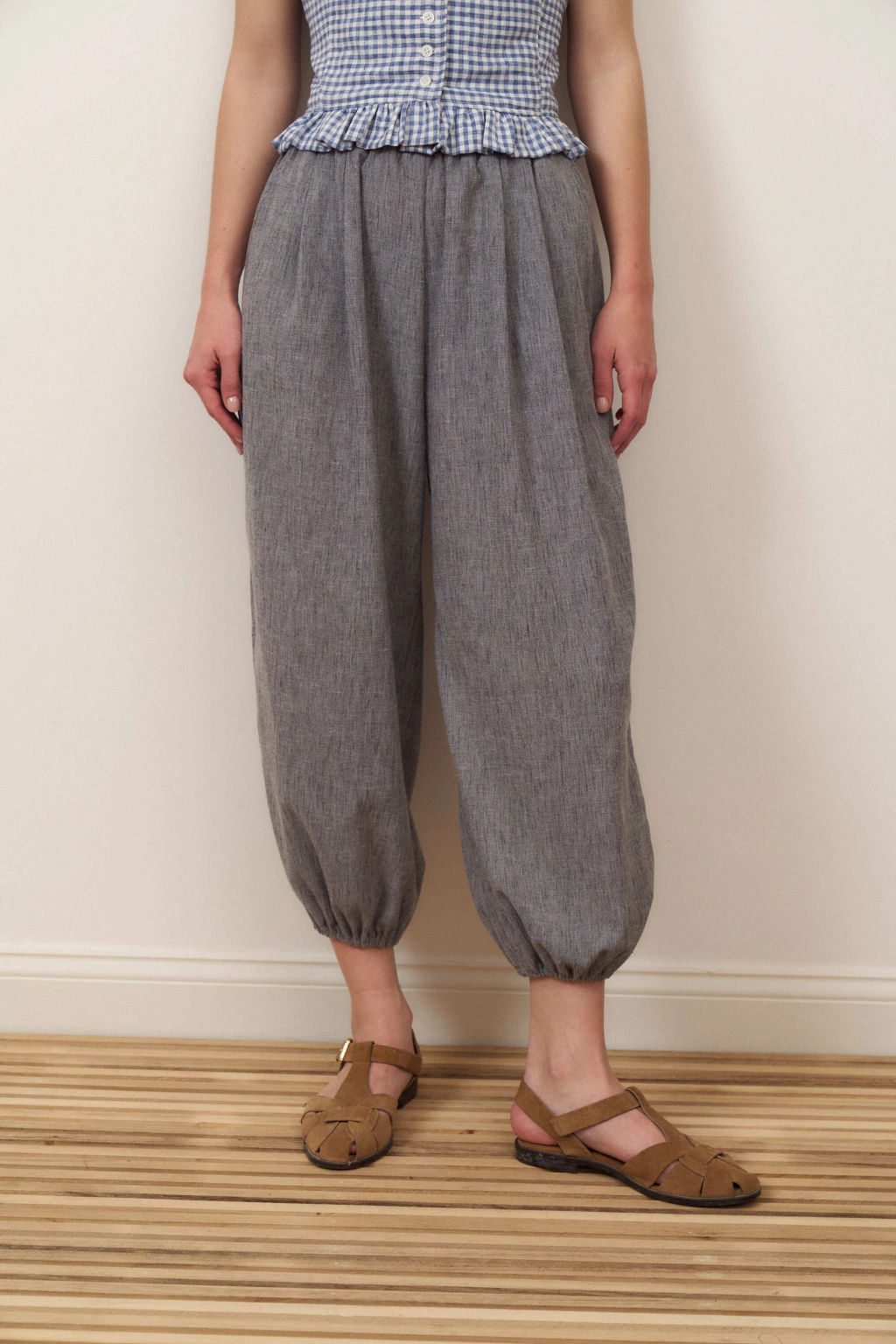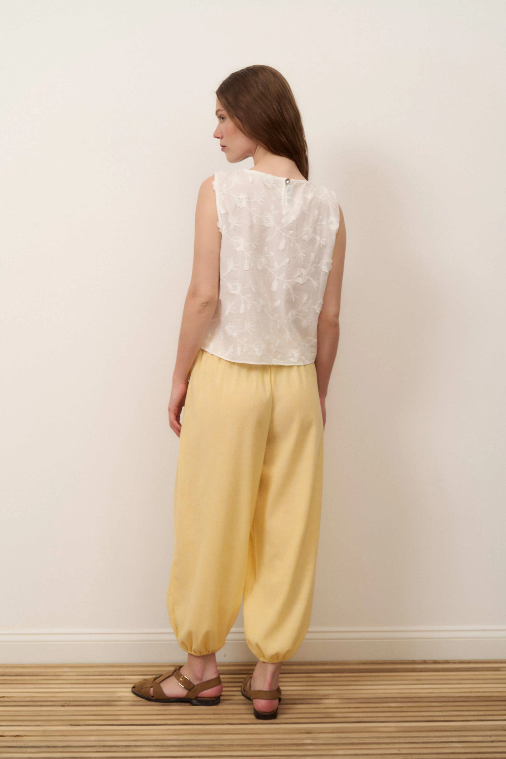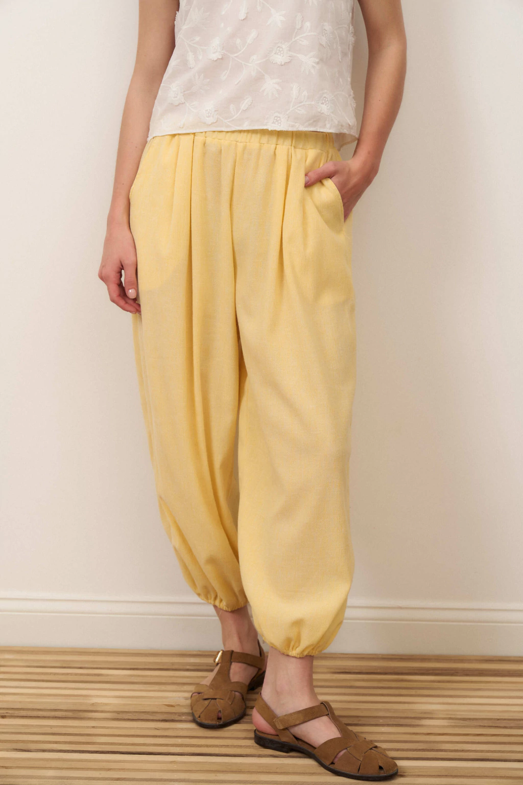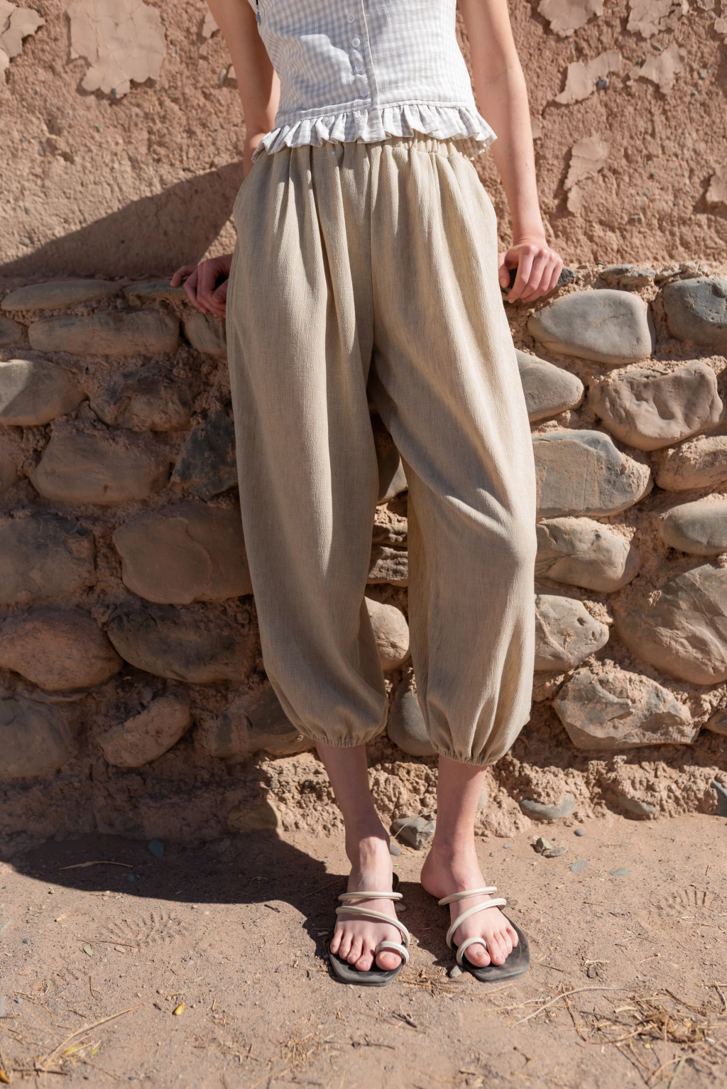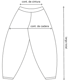 - Pantalón tiro medio con elástico en cintura y ruedo, y bolsillos en los laterales.