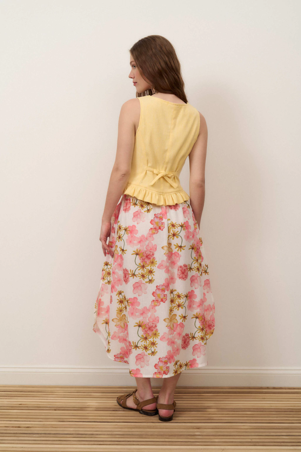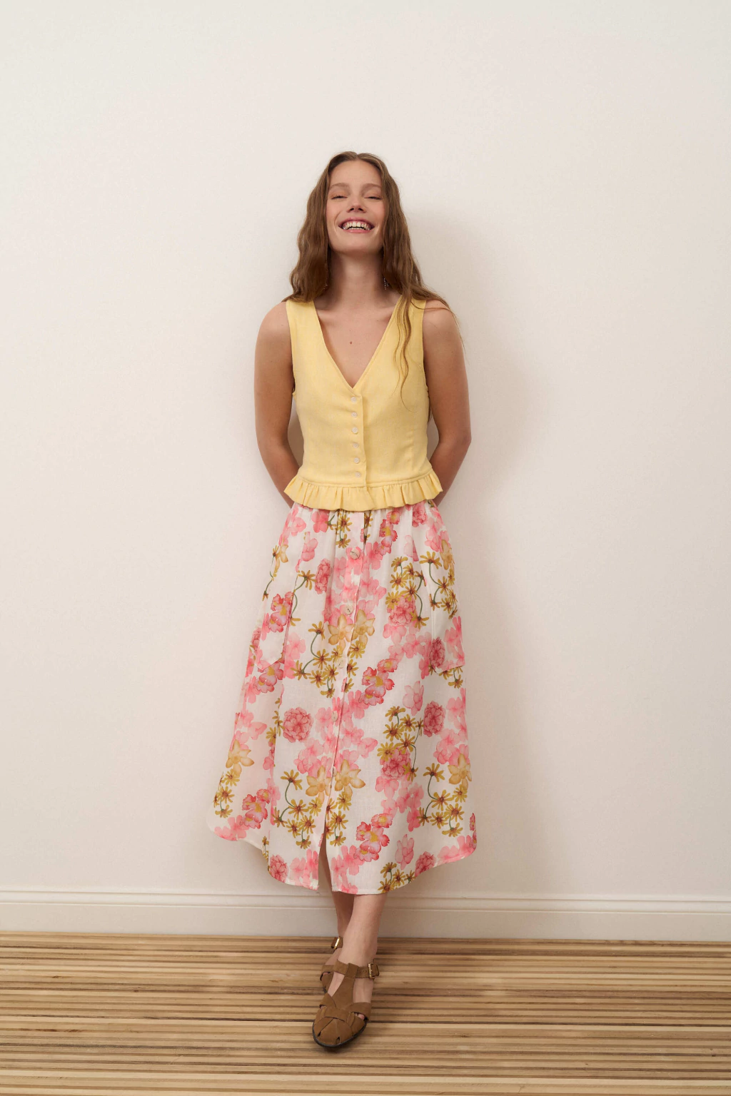 - Pollera con elástico en la cintura y bolsillos a los costados, detalles de botones en frente.