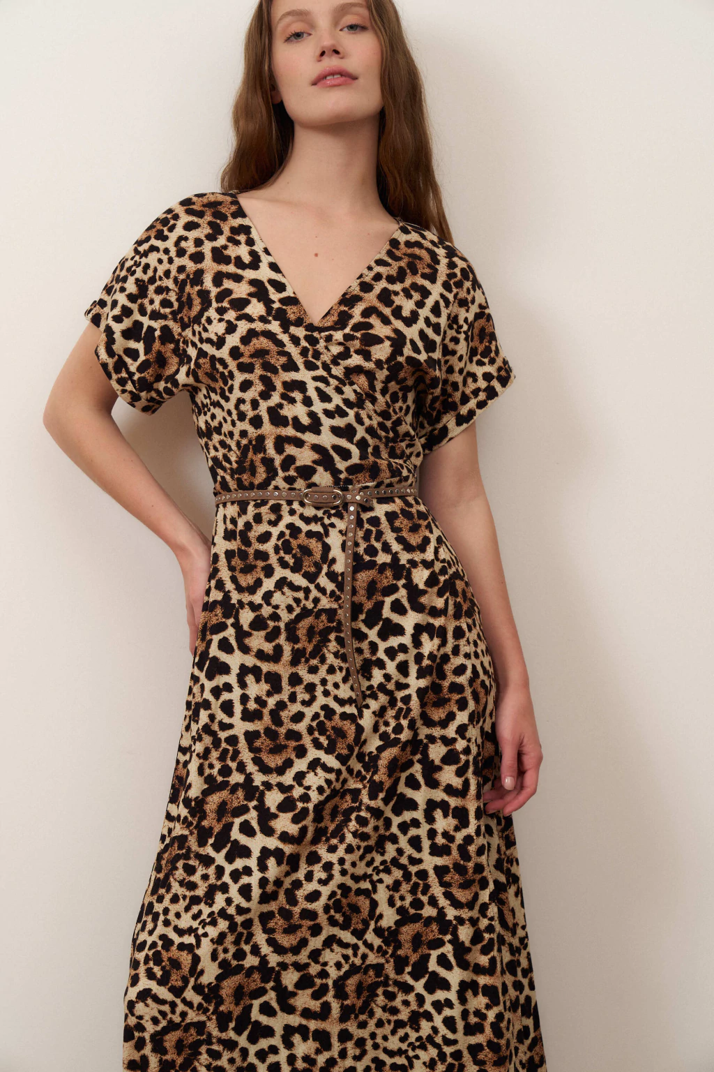 - Vestido manga corta cruzado, con lazo para atar en cintura.
