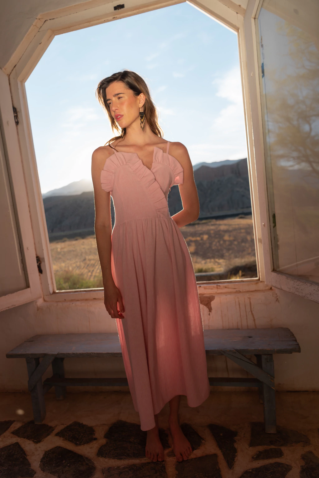 -Vestido con volado en escote y detalle de elásticos en la espalda.
